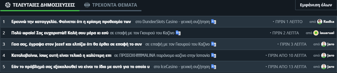 Τα φόρουμ του Casino Guru είναι ένας διαδραστικός χώρος όπου οι παίκτες μπορούν να ανταλλάσσουν απόψεις, να μοιράζονται εμπειρίες και να ζητούν συμβουλές σχετικά με τα online καζίνο. Οι συζητήσεις καλύπτουν μια ποικιλία θεμάτων, όπως μπόνους, στρατηγικές παιχνιδιού, θέματα αναλήψεων και κριτικές καζίνο.